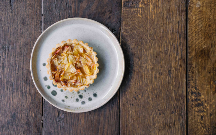 Den Teig in vier Stücke teilen und die Förmchen damit auskleiden. Apfelfüllung gleichmäßig darauf verteilen.