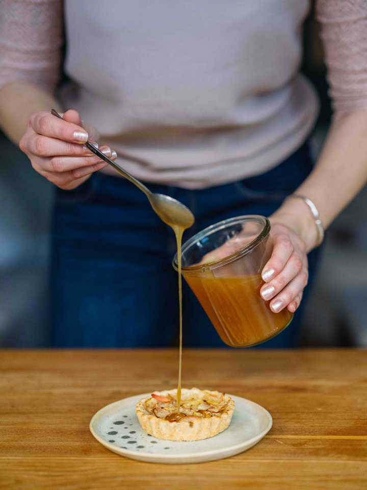 - In den Formen auskühlen lassen, anschließend vorsichtig herauslösen, mit Salzkaramell beträufeln und servieren.