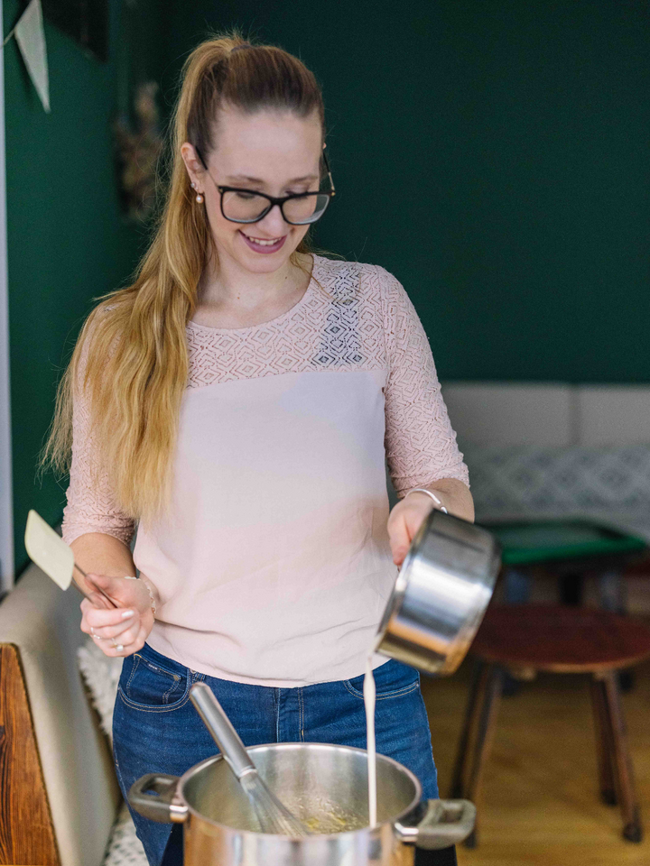 - Margarine portionsweise zugeben und mit dem Schneebesen einrühren. Die erwärmte Hafercuisine langsam unter Rühren einarbeiten. Topf vom Herd ziehen, Salz einrühren und – sobald das Karamell glatt und cremig ist – kurz abkühlen lassen.