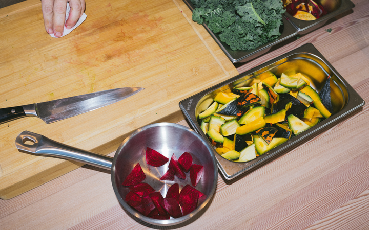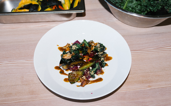 - Rote Rüben, Topinambur, Kürbis und Palmkohl dekorativ auf Tellern verteilen. Mit der Rote-Rüben-Marinade beträufeln. Mit Wildkräutern bestreuen und die gerösteten Nüsse sowie die knusprigen Sojabohnen darübergeben.
