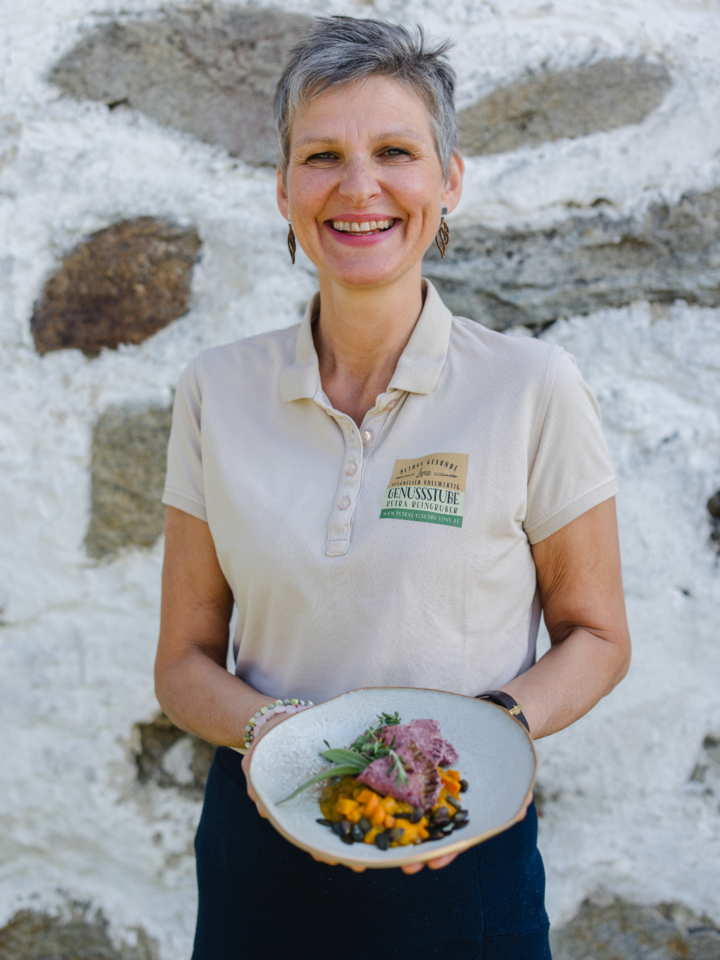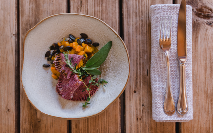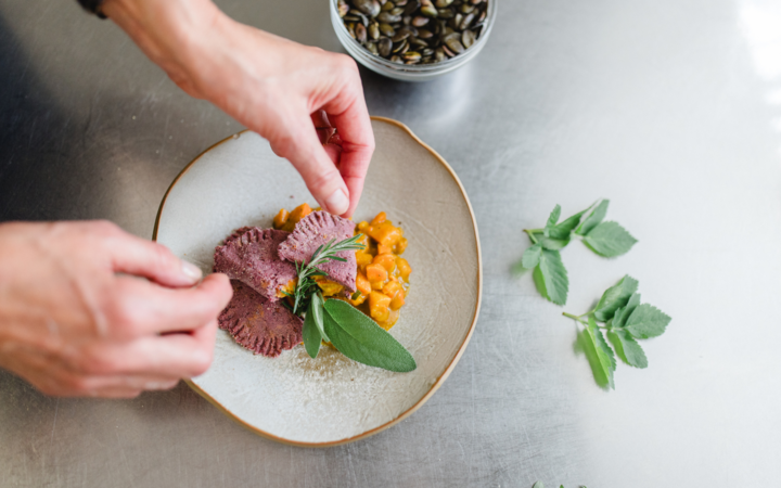 „Ich bereitete die Rote-Rüben-Tascherl auf einem cremigen Kürbisragout zu – ein Gericht, das einfach perfekt in den Herbst passt. Die warmen Farben harmonieren wunderbar miteinander und spiegeln die Saison wider. Hier vereinen sich feiner Geschmack, liebevolle Handarbeit und eine pflanzlich-vollwertige Küche zu einem Genuss, der nicht nur sättigt, sondern auch das Auge verwöhnt.“