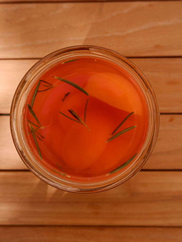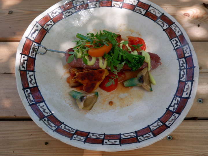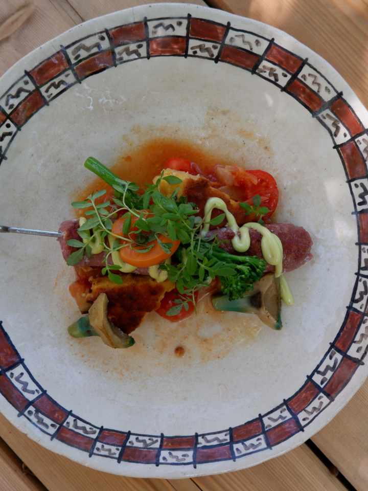 - Für das Ratatouille Zwiebel und Knoblauch fein hacken, das übrige Gemüse in etwa 1 cm große Würfel schneiden. Zwiebeln in etwas Olivenöl anschwitzen, Knoblauch zugeben, dann das restliche Gemüse und Tomatenmark mitrösten. Mit Holunderessig und frischen, pürierten Tomaten ablöschen. Thymian und Rosmarin zugeben und das Ganze etwa 20 bis 30 Minuten sanft schmoren lassen. Mit Salz, Pfeffer und Zitronensaft abschmecken.