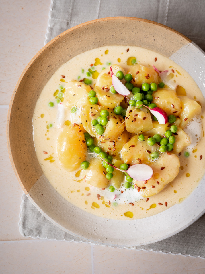 Im Oberösterreich, insbesondere im Mühlviertel, sind Leinölerdäpfel seit jeher tief verwurzelt und galten früher als einfaches, aber nahrhaftes Gericht aus der bäuerlichen Küche. Leinöl wurde auch gerne als „flüssiges Gold“ bezeichnet und geschätzt. Meine Leinölerdäpfel genieße ich gerne frühlingshaft mit frischen Erbsen und Radieschen, und auch frische Kresse schmeckt herrlich dazu. Zubereitet habe ich das Rezept mit dem hochwertigen, kaltgepressten Bio-Leinöl vom Slow Food Betrieb farmgoodies aus dem Mühlviertel.