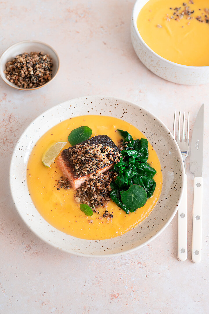 Lachsfilets zusammen mit dem Butternuss-Püree, dem Mangold und den Schwarzkümmel-Walnuss-Bröseln anrichten.