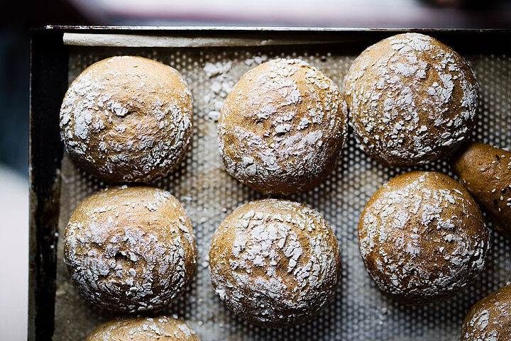 Bernhard hat eine klare Vision: „Ich möchte nicht zu groß werden. Je mehr Kund:innen man hat, desto mehr leidet die Qualität des einzelnen Brots und Gebäcks.“ Maschinen sind in seiner Backstube rar gesät. Dort findet man lediglich zwei Teigkneter, eine Semmelstanze und den Brotbackofen. Den Großteil der Arbeit erledigt Bernhard von Hand: Eine Semmel etwa greift er sechs Mal an, bevor sie zu einer Semmel wird. „Jedes Produkt braucht seine Zeit, aber das passt schon“, sagt er. In seiner kleinen "Garagen-Bäckerei" stellt er eine Handvoll unterschiedlicher Bio-Brote mit einstufigem Sauerteig und Hefe her. „Eigentlich ist es ideal, weil ich keine weiten Wege habe", sagt Bernard. Das Brot lässt er oberhalb der Tafel auf Brettern in der Hochgare gehen („Da ist es immer schön warm“). Alle Rezepte hat er selbst entwickelt, das Vollkornmehl mahlt er in seiner eigenen Mühle. Vollkornmehl ist in all seinen Backwaren enthalten, sogar in seinen Semmeln. Besonders beliebt sind das „Mei Liabst’s“ Bauernbrot und das Ramsauer Gewürz-Bauernbrot, das Bernhard mit einer kräftigen Mischung aus Kümmel, Fenchel, Anis und Koriander würzt und mit 98% Roggenmehl bäckt. Zusätzlich produziert er rund zehn verschiedene Gebäcke und bäckt täglich vier bis fünf verschiedene Kuchen, einmal in der Woche sogar Kekse wie Linzerstangerl.