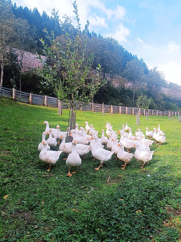 Die Hühner, Weidegänse und Wildhendl werden tiergerecht gehalten und haben viel Platz auf den weitläufigen Weiden des Hofes zum Scharren und Picken. Sie werden ausschließlich mit biologischem Futter versorgt und haben Zugang zu frischem Gras und Kräutern. Diese artgerechte Haltung sorgt für gesunde Tiere und hochwertige Fleischprodukte. Am Biohof Brugger wird großer Wert auf das Wohl der Tiere gelegt – bis zuletzt durch eine stressfreie Schlachtung direkt am Hof.