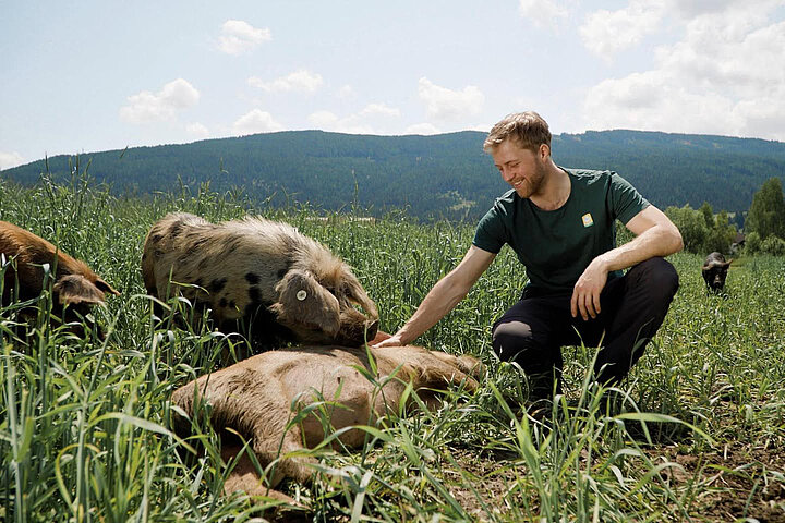 In diese Kreislauf- und Biodiversitätsbewirtschaftung ist auch die Haltung des Schwarzen Alpenschweins eingebunden, einer selten gewordenen Rasse, die seit 2018 am Biohof Sauschneider gehalten wird. Rund 35 Tiere leben ganzjährig im Freien und sind an die klimatischen Bedingungen des Lungaus angepasst – mitunter kann es im Winter bis zu minus 20 Grad kalt werden. Die Tiere sind beweglich und kommen auch in steilem Gelände gut zurecht. Sie wachsen langsam und brauchen deutlich länger bis zur Schlachtreife als konventionelle Rassen. Beim Wühlen lockern sie den Boden und übernehmen damit einen Teil der Bodenbearbeitung. Ihr Fleisch ist fein durchzogen, der Speck weich und aromatisch.