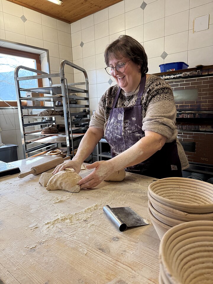 Auch nach der Ernte bleibt der Roggen am Hof: Er wird gedroschen, getrocknet, gereinigt und in der hofeigenen Mühle vermahlen, bevor er weiterverarbeitet wird. Daraus entsteht ein reines Roggenvollkornbrot, das mit Natursauerteig und ohne Zuchthefe im Steinofen gebacken wird. Elisabeth bäckt drei- bis viermal pro Woche Brot und Gebäck für den Hofladen, für Vorbestellungen und für Gäste. Ergänzt wird das Sortiment durch Nudeln, Knäckebrot, süße Backwaren, Leindotteröl sowie verarbeitete Produkte wie Sugo und Speck.