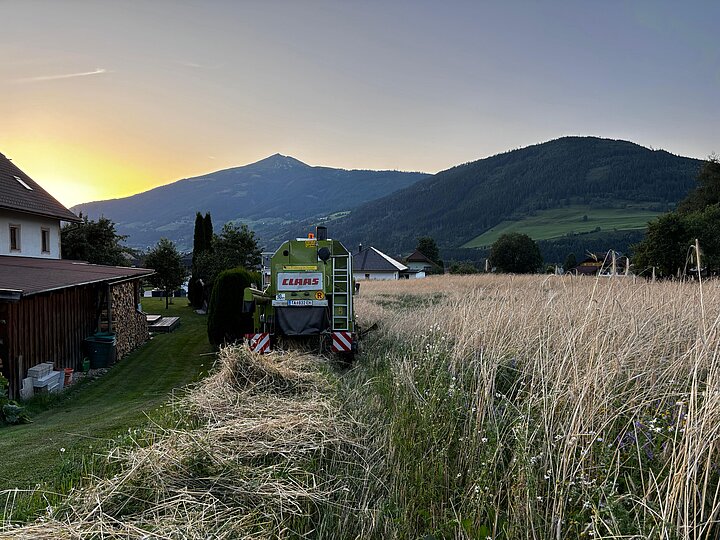 Auch die Förderung der Biodiversität ist Teil der Bewirtschaftung. Matthias sammelt mit einem Wiesensaatgut-Ernte-Gerät Samen von artenreichen Wiesen und bringt diese auf anderen Flächen im Lungau wieder aus.
