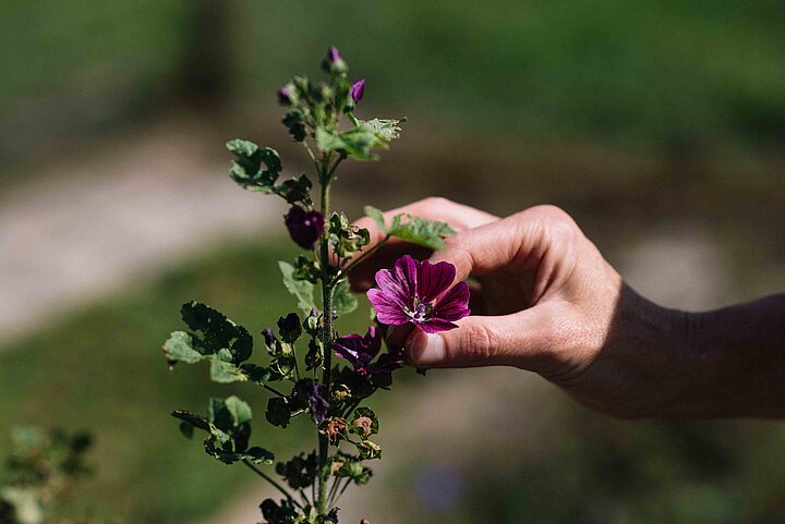 Ein besonderes Herzstück des Hofes sind die Blüten, die Barbara mit Hingabe kultiviert. Als diplomierte Heilkräuterpädagogin hat sie sich intensiv mit den Wirkungen heimischer Pflanzen beschäftigt. Aus dem Wissen über Heilpflanzen entstand die Freude, Blüten auch kulinarisch erlebbar zu machen.