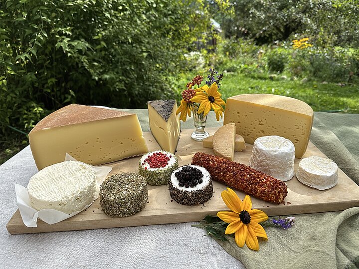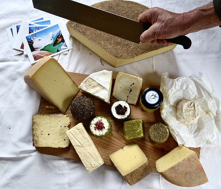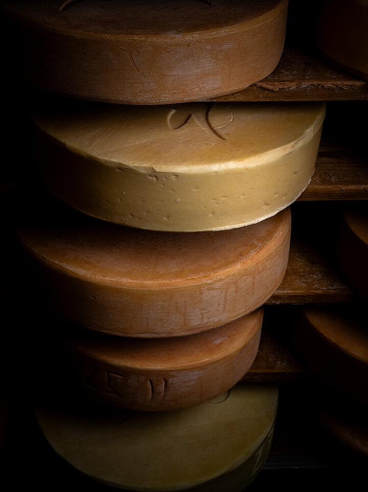 Rund 15 Sorten entstehen so aus Kuh- und Ziegenrohmilch: Frischkäse, mehrere Monate gereifter Bergkäse, Blauschimmelkäse nach französischem Vorbild, Crottin, Raclette oder Mozzarella. Viele Käsesorten hat Klara von ihrem Vater übernommen, Raclette, Mozzarella und Crottin sind bereits ihre eigenen Entwicklungen.