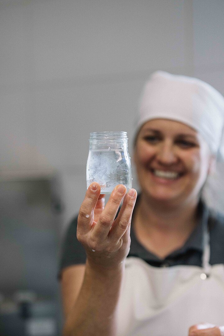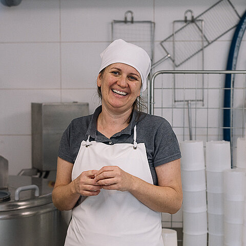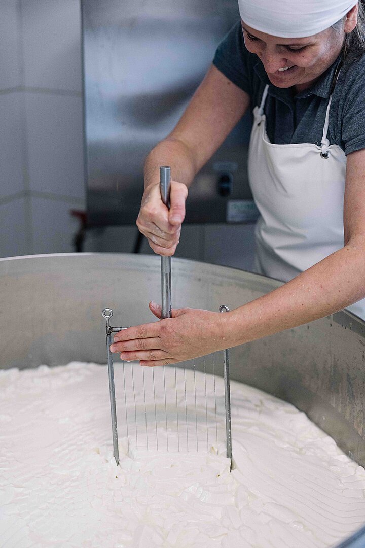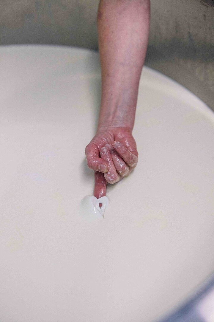 Gekäst wird mit größter Sorgfalt – in kleinen Mengen und ausschließlich mit Rohmilch. „Die Kunst ist es, ein sicheres und wertvolles Produkt herzustellen“, sagt Eva-Maria, die über die Jahre ein engmaschiges Kontrollsystem aufgebaut hat. Jede Charge wird vor der Auslieferung sensorisch überprüft und regelmäßig gehen Proben ins Labor. Im 130-Liter-Kessel rührt sie das Lab noch mit der Hand ein, damit die Milch exakt im richtigen Moment stockt.