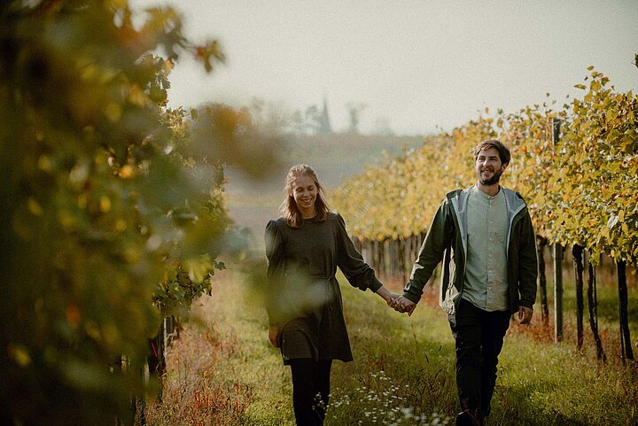 Glücklicherweise führten ihre Wege sie zur selben Zeit wieder nach Hause – und zusammen. Elena war fasziniert von biologischer und regenerativer Landwirtschaft und konnte Paul damit anstecken. Bio brachte sie wieder zusammen: zueinander und zum Hof. Heute stehen sie – dankbar und manchmal selbst überrascht – gemeinsam in den Weingärten, die nun ihre Zukunft sind.