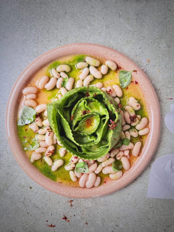 | Statt klassischer Hausmannskost wird die Sechs-Wochen-Bohne hier neu gedacht: Slow Food Köchin Bernadette Wörndl verwandelt sie in eine gefüllte Agnolotti-Schnecke. Der grüne Pastateig aus Spinat umhüllt eine feine Ricotta-Bohnen-Füllung, in der das cremig pürierte Bohnenmark auf zitronige Frische trifft. Serviert mit Blutorangen-Butter ist das Rezept eine feinsinnige Hommage an die italienische Pasta e Fagioli – und gleichzeitig ein Spiel mit regionaler Tradition, das zeigt, wie vielseitig alte Landsorten sein können, wenn man sie mit Respekt – und ein wenig Neugier – neu interpretiert. | | | |