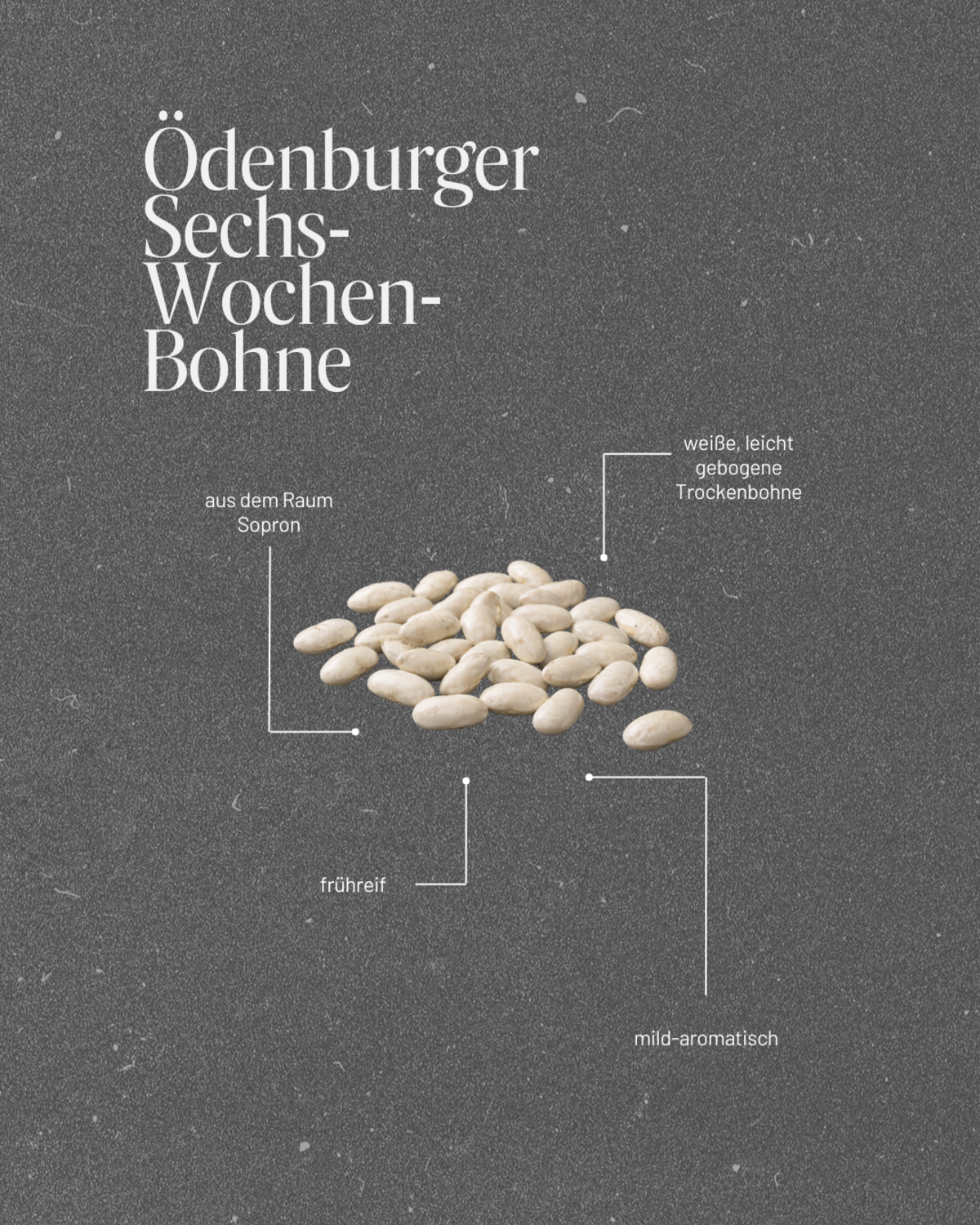 | Zwischen Rebstöcken wuchs sie früher ganz selbstverständlich: die Ödenburger Sechs-Wochen-Bohne. Angebaut von den Ponzichter:innen rund um Sopron – Winzer:innen, die ihre Weingärten doppelt nutzten und neben Trauben auch Bohnen kultivierten. Ihr Name verrät Tempo: Sechs Wochen von der Aussaat bis zur frühen Ernte. Ihre Form ist nierenartig, leicht gebogen, ihr Geschmack mild und überraschend fein. In der Region war sie über Generationen hinweg die wichtigste Bohne – gekocht im Bohnensterz oder in saurer Suppe, einfache Gerichte mit langer Tradition. | | | |