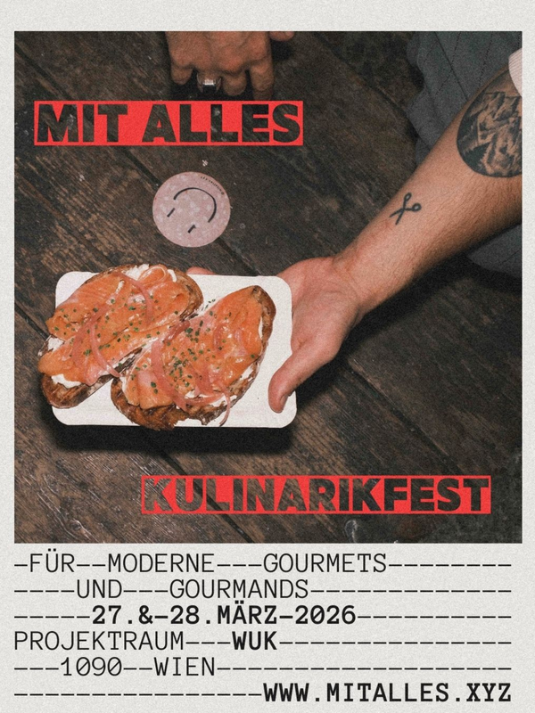 „Mit Alles“ Kulinarikfestival von Katrin Hofmann Am 27. und 28. März 2026 findet im Projektraum WUK in Wien bereits zum siebten Mal das Kulinarikfest „MIT ALLES“ statt. Initiiert wurde das Format von Katrin Hofmann. Einmal im Jahr bringt „MIT ALLES“ jene Menschen zusammen, die mit hochwertigen Lebensmitteln arbeiten oder sie herstellen. Besucher:innen können sich durch Naturweine (u.a. von den Slow Food Betrieben Weingut Schmelzer und Bioweingut Lehner), fermentierte Getränke, Cidre, Wermut oder alkoholarme Drinks kosten und neue Geschmackswelten entdecken. | | | |