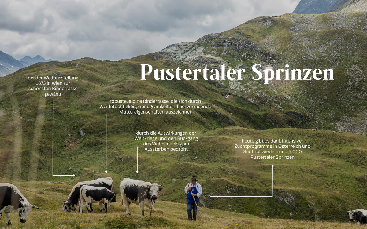 | Die Pustertaler Sprinzen galten einst als die schönste Rinderrasse Europas. Bei der Weltausstellung 1873 in Wien wurden sie für ihre markante Zeichnung gefeiert: roter oder schwarzer Körper mit weißen Streifen, als „Sprinzen“ mit feinen Tupfen oder als „Schecken“ mit größeren Flecken. Die robuste alpine Rasse stammt aus dem Tiroler Pustertal und ist ideal an die Bergweidehaltung angepasst – genügsam, weidetüchtig und mit ausgeprägten Muttereigenschaften. Durch die Weltkriege und den Zusammenbruch des traditionellen Viehhandels gerieten die Pustertaler Sprinzen jedoch stark unter Druck und waren zeitweise vom Aussterben bedroht. Dank engagierter Züchter:innen wie Thomas Strubreiter aus Scheffau und gezielter Erhaltungsprogramme in Österreich und Südtirol gibt es heute wieder rund 5.000 Tiere. Geschätzt wird neben ihrer Bedeutung für die Biodiversität auch die Qualität ihres fein marmorierten, aromatischen Fleisches. | | | |