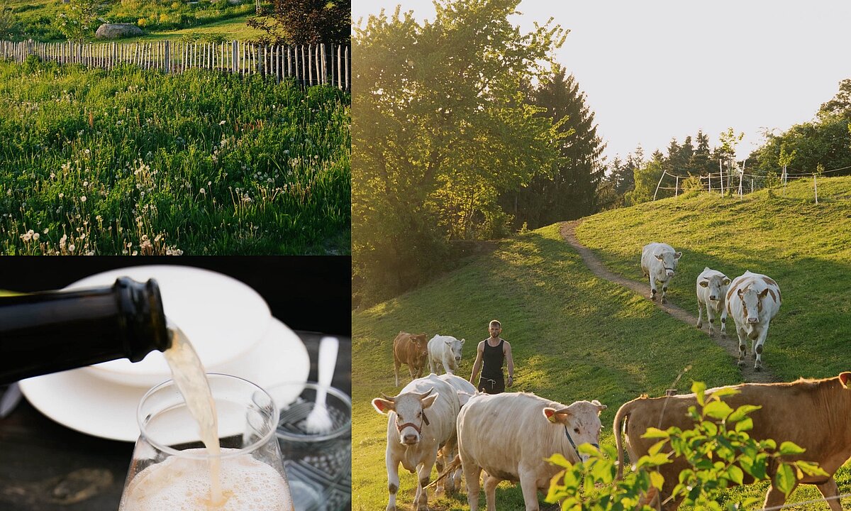 Im Mittelpunkt steht die Mutterkuhhaltung mit der hochgefährdeten Rinderrasse Waldviertler Blondvieh aus der Arche des Geschmacks, die hier in Alleinlage mit Blick auf die Alpen gehalten wird. Neben den Tieren erwarten die Besucher:innen Streuobstwiesen voller alter Apfel- und Birnensorten – ein lebendiger Schatz an Biodiversität. Ergänzt wird dies durch ein zukunftsweisendes Agroforst-System: Baumweiden mit Edelkastanien, Walnüssen und Quitten, die Schatten spenden und neue Vielfalt schaffen.