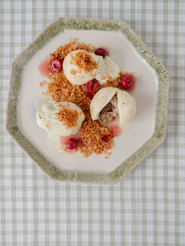 |  Herzhafte Topfenknödel mit Pulled-Duck-Füllung, Butterbröseln und geschmorten Weichseln | |