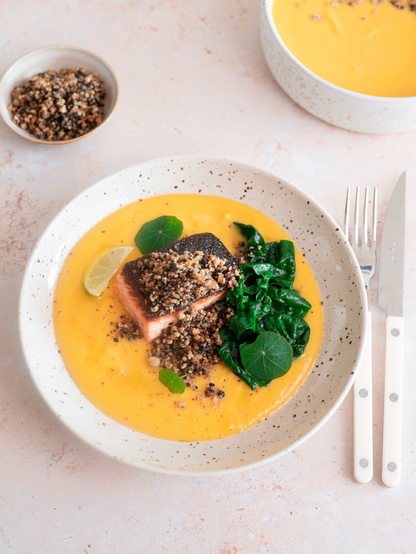 |  Slow Food in deiner Küche: Lachsfilet mit Butternusskürbis-Püree, Mangold und Schwarzkümmel-Walnuss-Bröseln Mit der warmen, orangen Farbe des Butternusskürbisses, dem satten Grün des Mangolds und dem nussigen Geschmack der Walnüsse bringt unsere Slow Food Köchin Babs Zobl die Aromen und Farben des Herbstes auf den Teller. | |