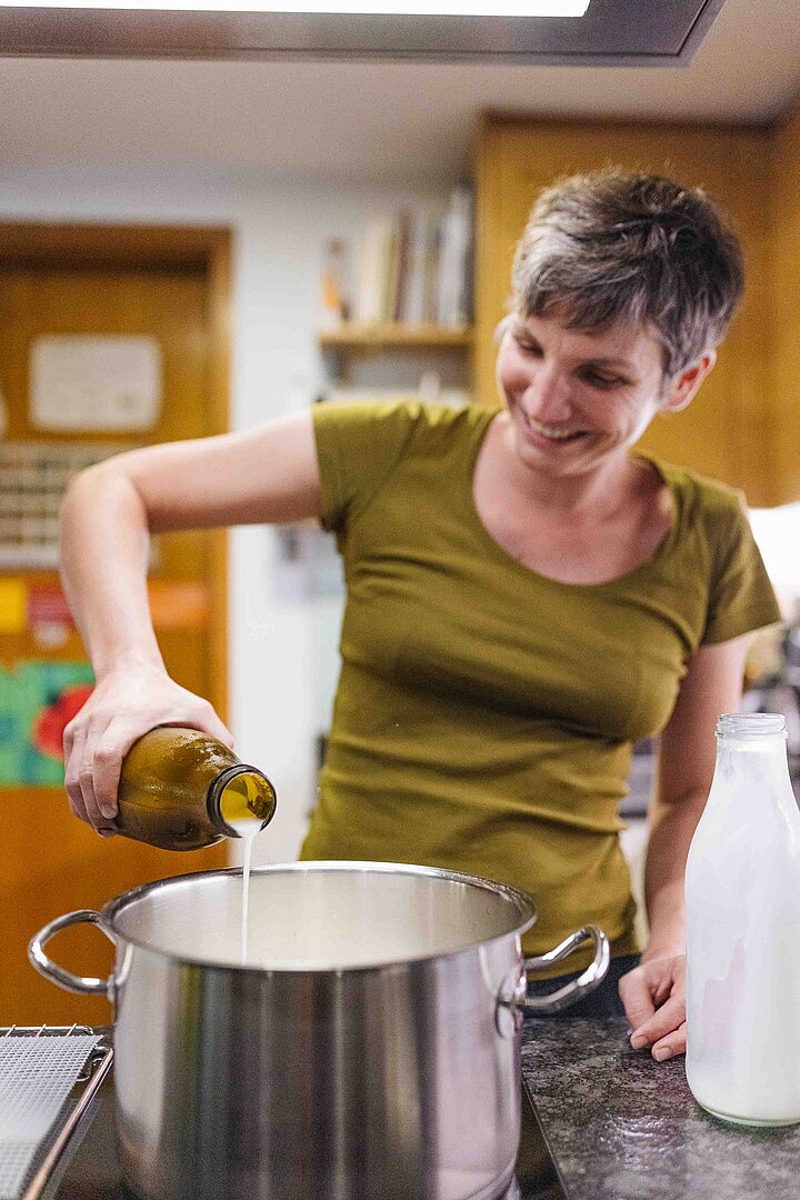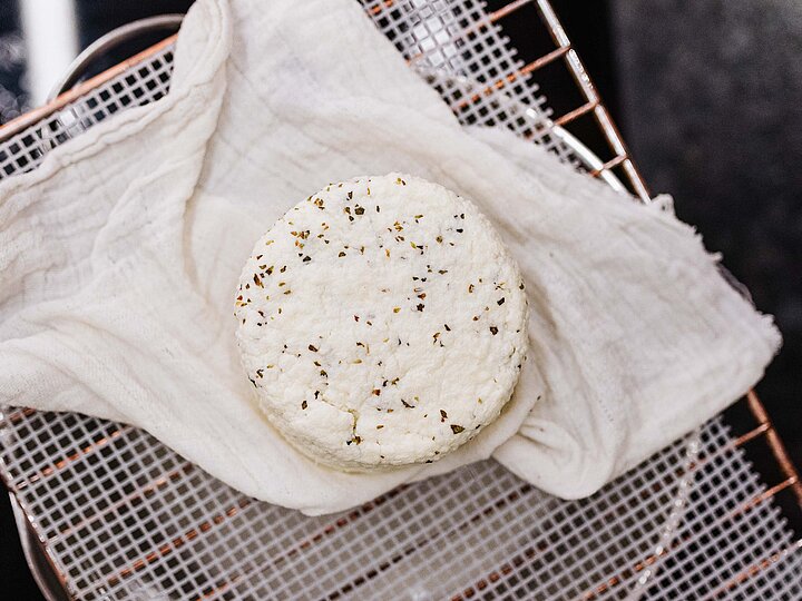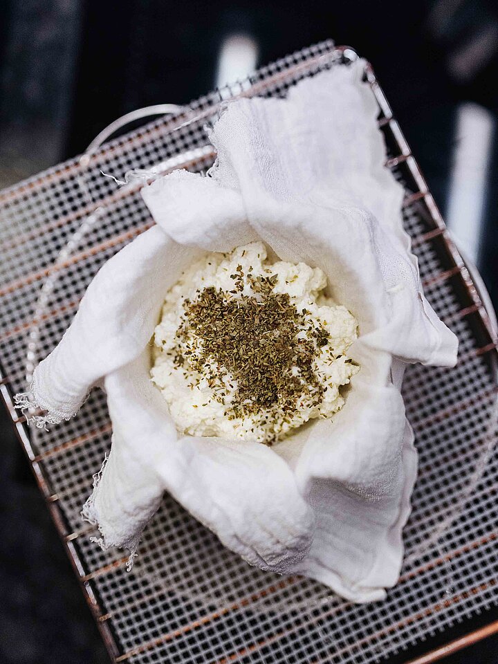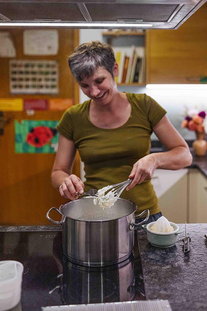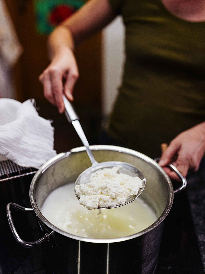 „Gleich wird’s magisch“, kündigt Isabella an, als die Milch im Topf beim Erhitzen ausflockt. Mit sicherer Hand zeigt sie, wie der Käsebruch in die Formen gefüllt wird, wie sie ihn würzt, mit Kräutern verfeinert und wie viel Zeit er braucht, bis er fertig abgetropft ist und angeschnitten werden kann. Tipps und Tricks aus ihrer jahrelangen Erfahrung gehören genauso dazu wie Hinweise, wie die übrig gebliebene Molke weiterverwendet werden kann. Und dann hält man tatsächlich ein Stück selbst gemachten Frischkäse in der Hand. Das ist unbestritten Magie.