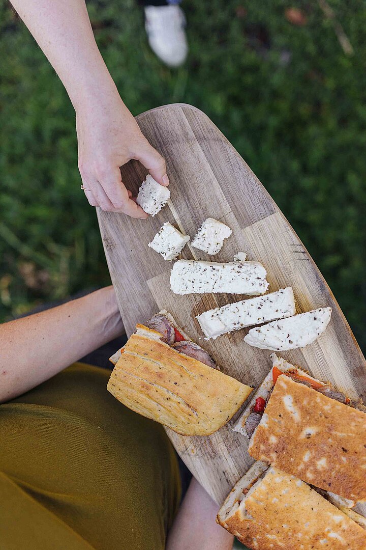 Zum Abschluss wird der Picknickkorb gepackt: Der frisch gemachte Käse wandert ebenso hinein wie Isabellas ofenfrisches Gebäck, Spezialitäten aus dem Gemüsegarten und Fleisch bzw. Wurst von den eigenen Tieren. Auf Wunsch kann der Picknickkorb auch ganz vegetarisch gepackt werden. Auf einem ausgemähten Streifen Wiese wandern wir hinauf hinters Haus. Zwischen blühenden Blumen und im Schatten der alten Obstbäume breiten wir Decken und Schaffelle aus. Gemeinsam wird gejausnet – mit Blick auf die umliegende Landschaft, den Schafen im Hintergrund und freilich unserem selbst gemachten Käse.