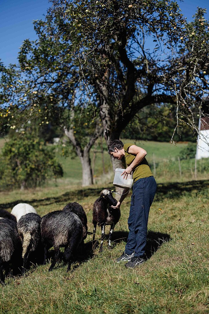 Für Krainer Steinschafe haben sich die beiden entschieden, weil die alte, genügsame und sehr resiliente Rasse gut zur hügeligen Gegend passt. Mittlerweile grasen rund 65 Tiere samt Lämmern unter Apfel-, Nuss- und Pfirsichbäumen. Vielfalt herrscht auch innerhalb der Herde – neben den typisch dunklen Steinschafen gibt es auch schwarze mit weißen Flecken, und sogar ganz weiße Tiere mischen sich ab und an darunter. Die Krainer sind nicht nur wegen ihres Fleisches wertvoll – ursprünglich wurden sie auch als Milchschafe gezüchtet. Und so liegt es nahe, ihre Milch für die Käseherstellung zu nutzen. „Ich probiere gerne herum mit dem, was da ist“, sagt Isabella.