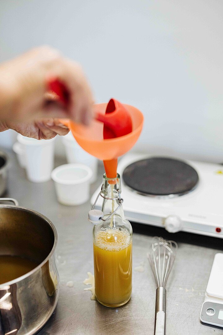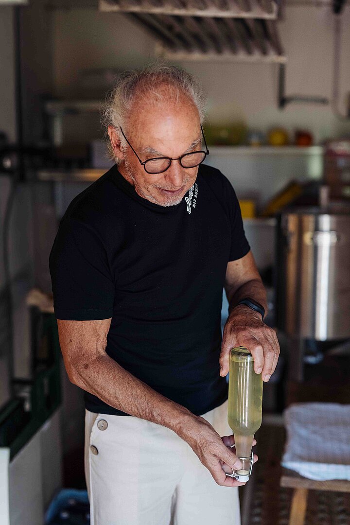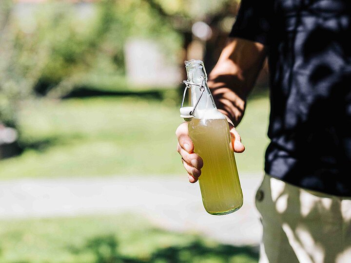 Albert erklärt unterdessen, wie das Zusammenspiel zwischen Weinhefe und Zucker funktioniert. Schließlich füllen wir den überkühlten Dombucha in Flaschen, wo sich jetzt auf natürliche Weise Kohlensäure entwickelt – in frühestens drei Wochen ist er trinkfertig. Aber: mehr Geduld wird belohnt: „Je geduldiger man ist, desto cremiger wird die Perlage“, sagt Albert. Glücklicherweise hat er noch einen perfekt gereiften Dombucha zum Verkosten eingekühlt.