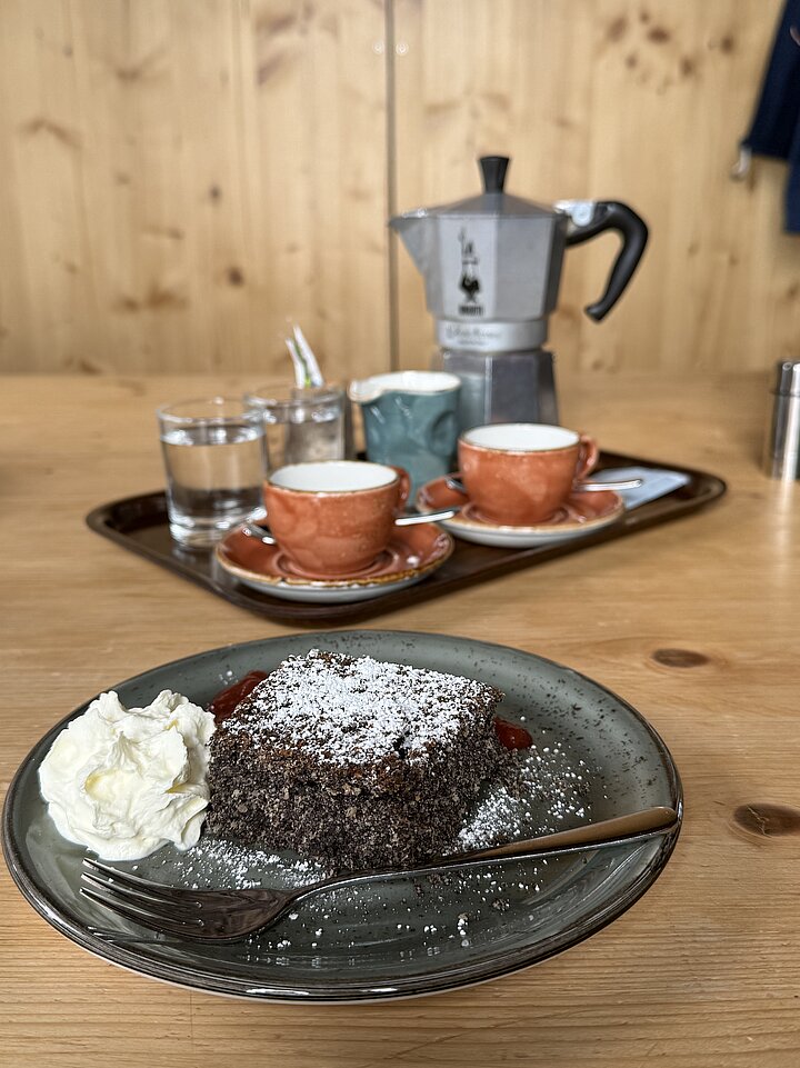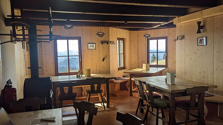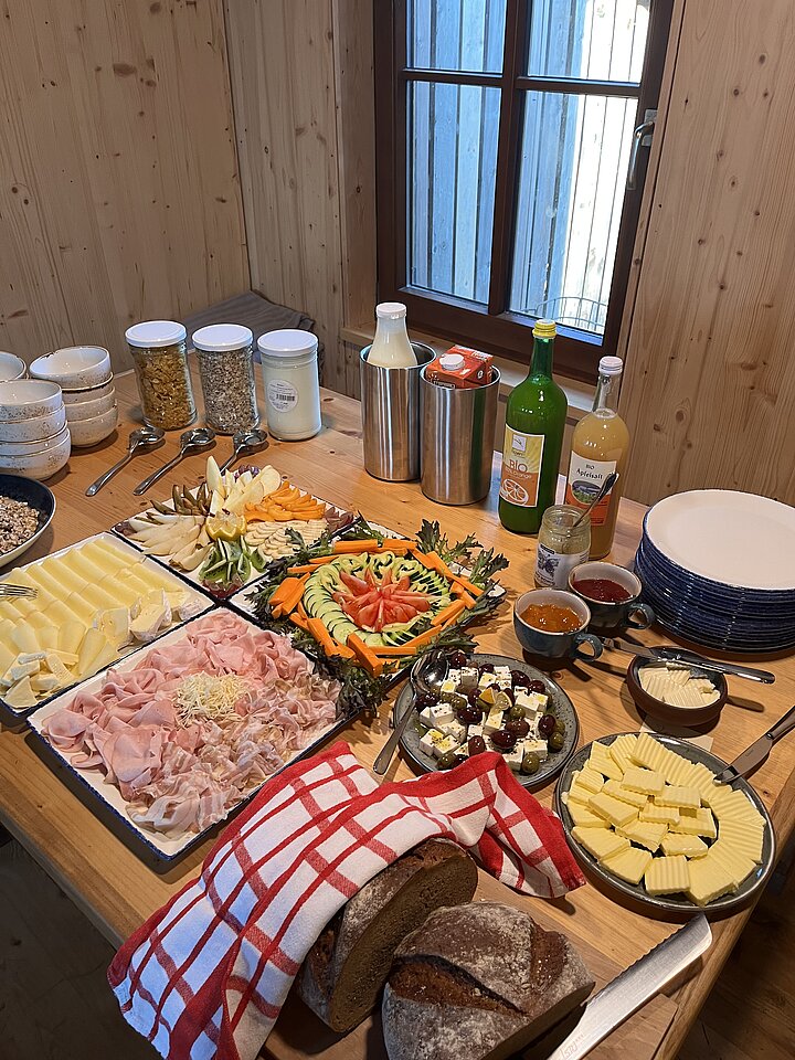An Sonn- und Feiertagen beginnt der Tag auf der Hütte mit einem ausgedehnten Genussfrühstück. Der Morgen startet mit warmem Porridge, danach folgen Brot, Käse, Aufschnitt, Aufstriche sowie Eiergerichte aus der Küche, dazu Obst, Säfte und Kaffee. Unter der Woche gibt es ein einfacheres Hüttenfrühstück. Warm gekocht wird mittags zwischen 11 und 14:30 Uhr, am Nachmittag stehen kleinere Jausengerichte bereit, das Abendessen wird am frühen Abend serviert.