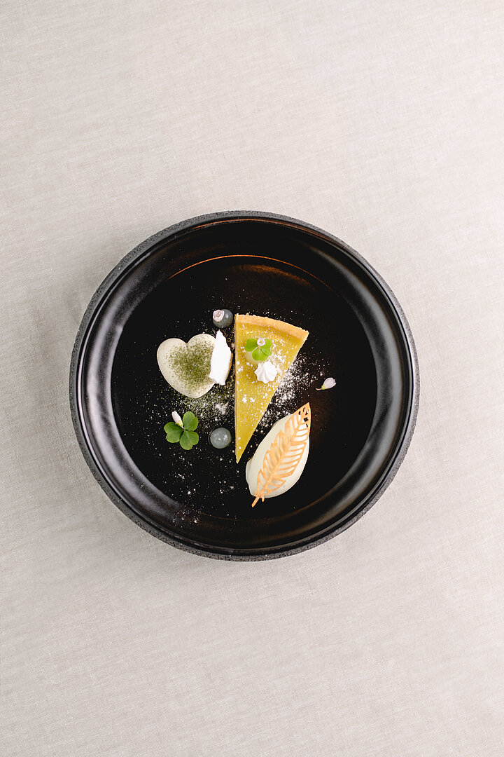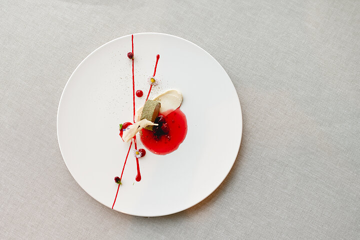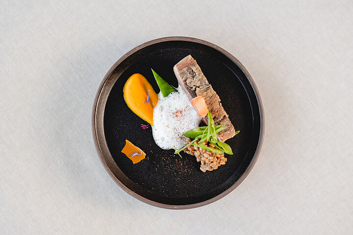 Edgar arbeitet konsequent saisonal, mit rund zehn Menüwechseln pro Jahr, und greift dabei immer wieder auf regionale Traditionen zurück, die er zeitgemäß weiterentwickelt. So finden sich etwa auch traditionelle Gerichte wie Lungauer Hasenöhrl auf Basis von Tauernroggen, Zubereitungen mit Lungauer Eachtlingen sowie Gerichte mit regionalem Wild aus dem Jagdgebiet Preber regelmäßig auf der Karte. Auch Fisch wie Saibling und Forelle aus der Fischzucht am Millstättersee sowie Getreide aus der Region verarbeitet er in unterschiedlichen Formen. Fleisch steht dabei insgesamt nicht im Zentrum. „Karotten und Brennnessel sind meine Lieblingsprodukte – sie sind universell einsetzbar, ich kann sie süß, neutral oder deftig zubereiten.“ Diese Haltung prägt auch die Entwicklung der Gerichte und Getränke. Begleitungen stellt Edgar vielfach selbst her, ausgehend von den in der Küche vorhandenen Produkten: „Ich schöpfe in der Küche ja quasi aus dem Vollen – vom Selleriestängel bis zur Tomatenessenz, Blüten und Beeren.“